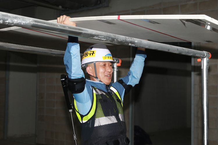 천장 도장, 배관, 석고보드 작업 등 장시간 상부 작업에 효과적이며, 시연 행사에서 근로자들이 직접 착용해 효과를 선보였다.