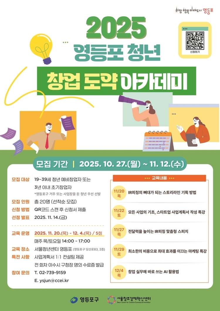 영등포구는 '청년 창업 도약 아카데미' 참여자 20명을 다음 달 12일까지 모집한다고 29일 밝혔다.