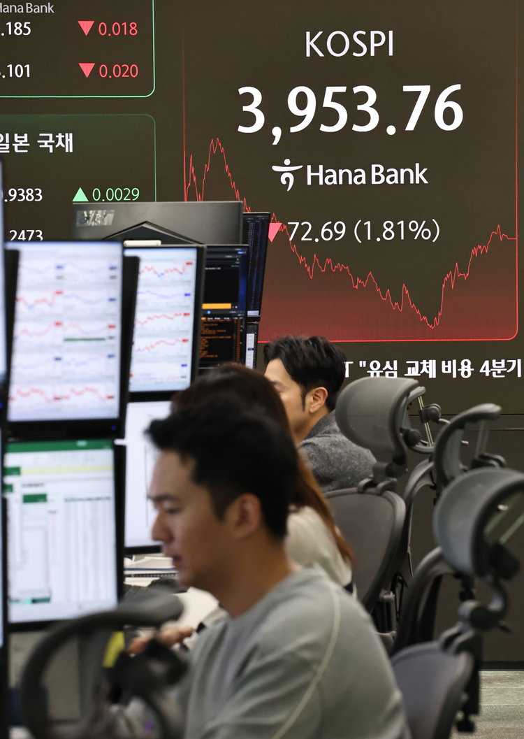 7일 한국거래소에 따르면 이날 코스피는 전장보다 72.69포인트(1.81%) 내린 3,953.76에 장을 마쳤다.
