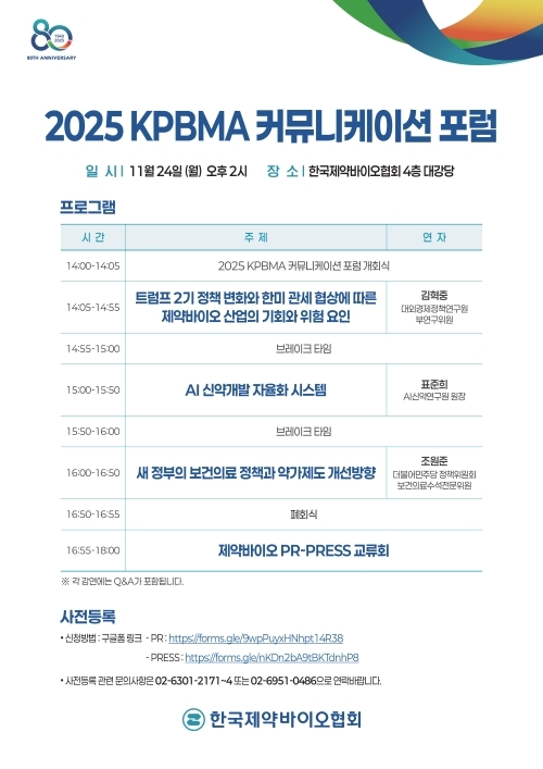 【 청년일보 】 한국제약바이오협회는 오는 24일 오후 2시 협회 4층 대강당에서 ‘2025 KPBMA 커뮤니케이션 포럼’을 개최한다고 11일 밝혔다.