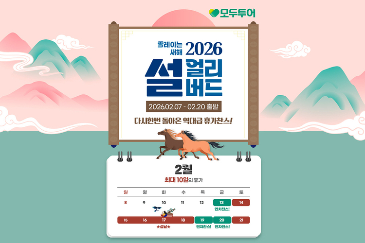 【 청년일보 】 모두투어는 2026년 설 연휴 여행 수요 증가에 발맞춰 ‘2026 설 얼리버드’ 기획전을 론칭하고, 최대 9일간의 황금연휴를 활용할 수 있는 다양한 인기 여행 상품을 선보인다고 27일 밝혔다.