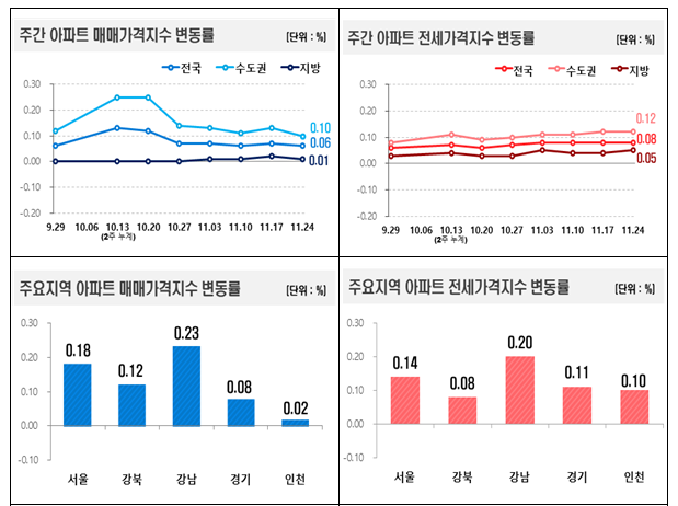 한국부동산원이 27일 발표한 11월 넷째 주(24일 기준) 주간 아파트 가격 동향에 따르면 서울 아파트 매매가격은 전주 대비 0.18% 상승했다.