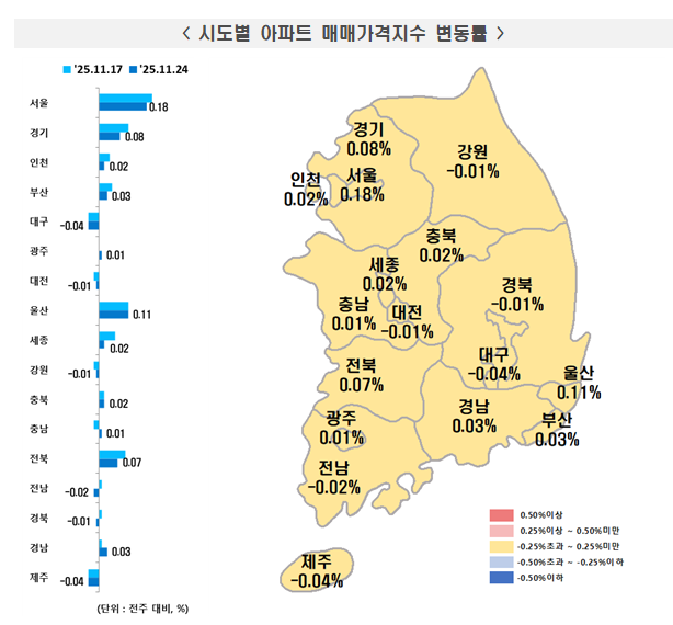 지방에서는 세종시가 매물 부족 현상을 겪으며 0.30% 상승했고, 울산(0.12%)과 부산(0.09%)도 오름세를 보였다.
