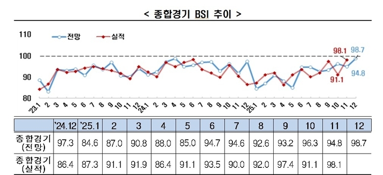 12월 조사 부문별 BSI는 내수(98.1)·수출(97.3)·투자(95.0)를 비롯한 전 부문에서 부정 전망이 나타났다. 전 부문 부진은 지난해 7월 이후 1년 6개월째 이어지고 있다.