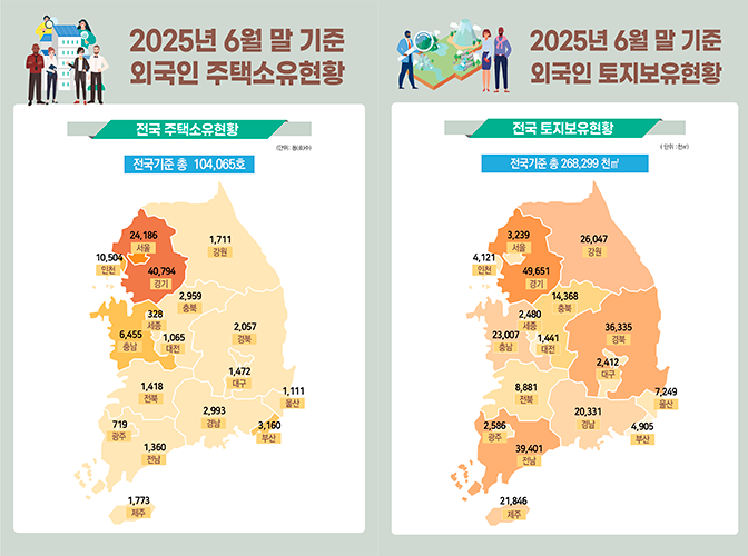 국토교통부가 28일 발표한 ‘2025년 6월 말 기준 외국인 토지·주택 보유 통계’에 따르면 외국인이 보유한 국내 토지 면적은 2억6천829만9천㎡로 전체 국토 면적의 0.27%를 차지했다.