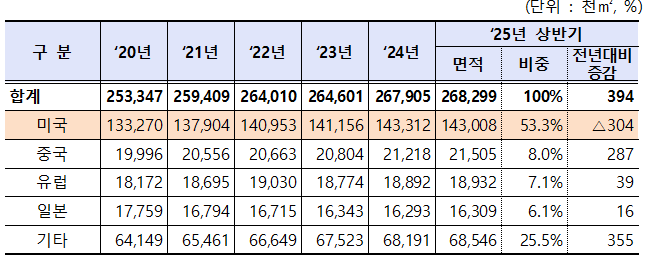 이어 중국(8.0%), 유럽(7.1%) 순으로 나타났다. 용도별로는 임야·농지 등 기타 용지가 67.7%로 대다수였으며, 공장 용지(22.0%)와 주거 용지(4.3%)가 뒤를 이었다.