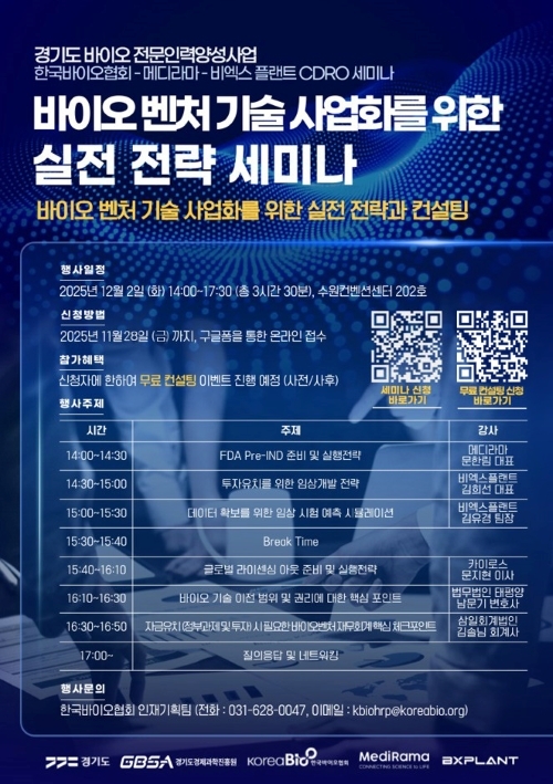 이번 행사는 경기도가 지원하고 경기도경제과학진흥원이 운영하는 ‘경기도 바이오 전문인력 양성사업’의 일환으로, 메디라마와 비엑스플랜트가 공동으로 주최한다.