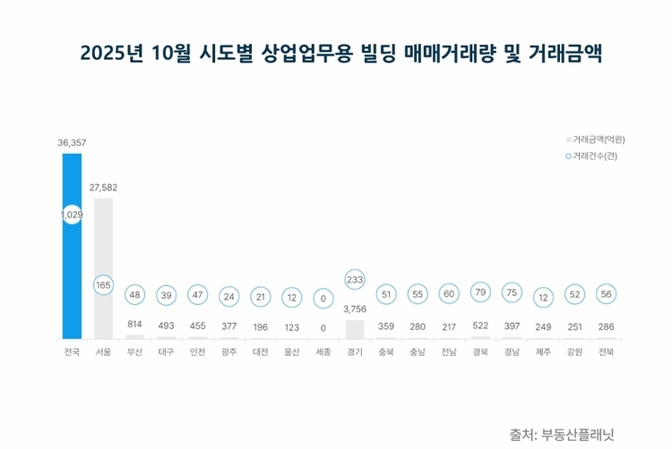 2일 빅데이터 및 AI 기반 상업용 부동산 전문기업 부동산플래닛이 발표한 자료에 따르면, 지난 10월 전국 상업·업무용 빌딩 거래는 총 1천29건으로 집계됐다.