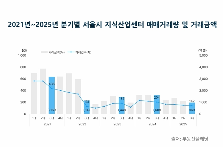 서울시 지식산업센터 거래량은 142건으로 전분기 대비 5.3% 줄었고, 거래금액은 969억원으로 12.8% 감소했다.