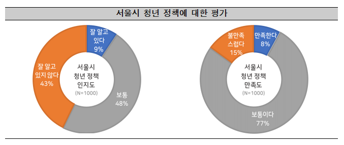 반면 서울시 청년 정책에 대한 인지도와 만족도는 개선이 필요한 것으로 나타났다. 정책을 '잘 알고 있다'는 응답은 9%에 불과했고, '잘 알고 있지 않다'는 답변은 43%에 달했다.