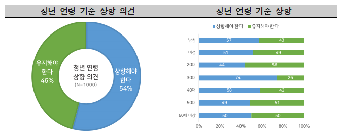 조사 결과에 따르면 현행 청년기본법상 청년 연령 기준을 상향하는 것에 대해 응답자의 54%가 찬성한다고 답했다. 반대는 46%였다.