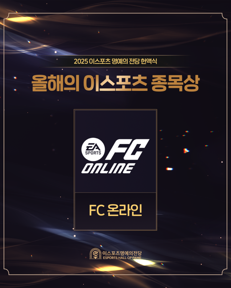 'FC 온라인'이 수상한 '올해의 종목상'은 한 해 동안 국내 e스포츠 발전에 가장 크게 기여한 종목에 수여하는 상으로, '2025 e스포츠 명예의 전당 헌액식' 선정위원회와 100명 이상의 e스포츠 업계인들의 투표로 선정됐다.