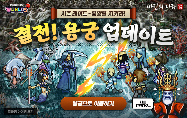 【 청년일보 】 넥슨이 자사 샌드박스형 플랫폼 '메이플스토리 월드' 내 오리지널 월드 '바람의나라 클래식'에 신규 레이드 콘텐츠 '결전! 용궁'을 업데이트했다.