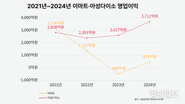 이마트는 2021년 약 3천156억원의 영업이익을 올렸지만, 이듬해인 2022년 약 1천357억원을 거둬들이는 데 그쳤다. 2023년에는 약 469억원의 영업손실을 기록했고, 작년의 경우 소폭 반등해 471억원으로 흑자전환했다.