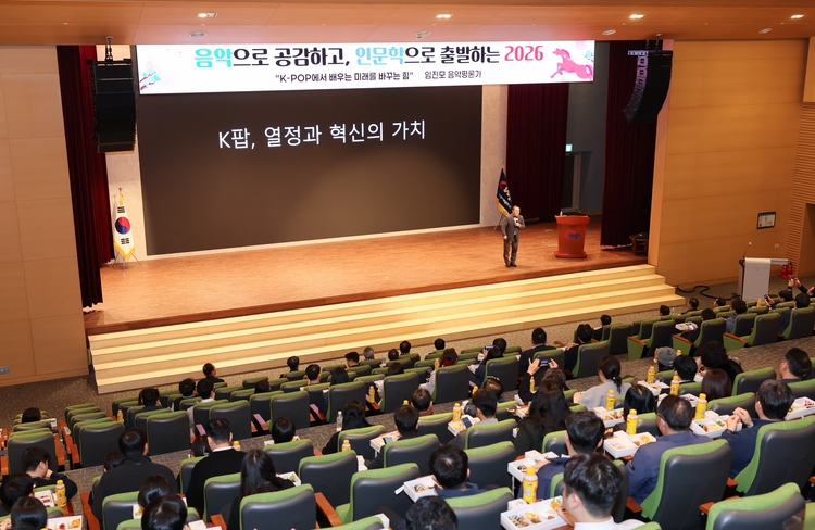 이어진 오후 일정에서는 지역 주민 및 유관기관 관계자 등 3백여 명이 참석한 가운데 ‘한입 인문학’ 신년 특강이 열렸다. 임진모 대중음악평론가가 강사로 나서 ‘케이팝에서 배우는 미래를 바꾸는 힘’을 주제로 진행된 이번 강연은, 에너지 전환과 ESG 경영이라는 다소 무거운 과제를 케이팝 콘텐츠와 결합해 인문학적 시각으로 풀어내며 참석자들의 깊은 공감을 이끌어냈다.