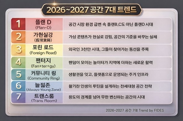 7일 업계에 따르면 부동산 디벨로퍼 기업 피데스개발은 전날 이 같은 내용을 담은 '2026∼2027년 7대 공간 트렌드'를 발표했다.