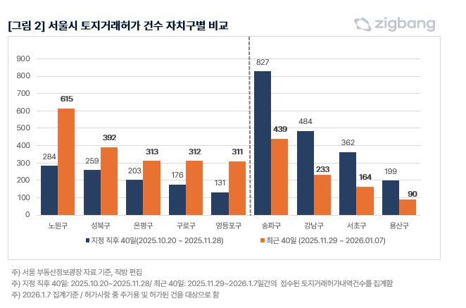 반면 새롭게 규제 대상에 포함된 비강남권 지역은 허가 건수가 가파르게 상승했다. 노원구는 284건에서 615건으로 117% 폭증했으며, 성북구(259건→392건), 은평구(203건→313건), 구로구(176건→312건), 영등포구(131건→311건) 등도 증가세가 두드러졌다.