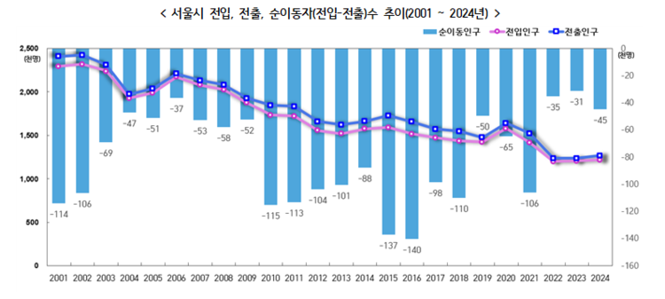 분석 결과에 따르면 서울 인구는 전출이 전입보다 많은 순유출 구조를 유지하고 있으나, 그 격차는 점차 줄어들고 있다. 2001년 11만 3천949명에 달했던 순유출 규모는 지난해 4만 4천692명으로 대폭 감소했다.