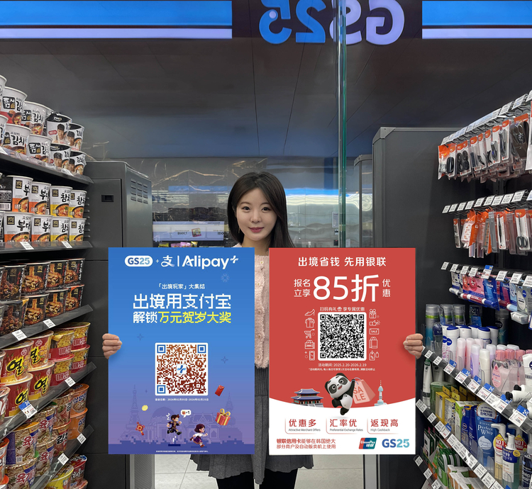 알리페이 고객을 대상으로 럭키 드로우 이벤트를 운영해 고액 금액권부터 소액 할인 혜택까지 차등 제공한다. 유니온페이 즉시 할인 프로모션은 국내 편의점 업계 단독으로 진행한다. 해당 프로모션은 외국인 상권 내에 있는 GS25 약 1,400점을 대상으로 운영되며, 고객 QR 스캔 및 카드 등록 후 유니온페이로 결제 시 15% 즉시 할인된다.