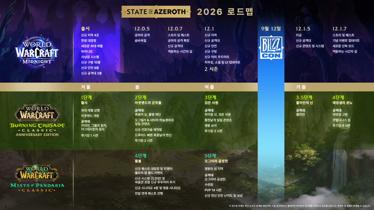 【 청년일보 】 블리자드 엔터테인먼트가 '블리자드 쇼케이스(Blizzard Showcase)'의 일환으로 진행된 '아제로스 현황 보고(State of Azeroth)' 방송을 통해 월드 오브 워크래프트(World of Warcraft)의 2026년 로드맵과 차기 확장팩 '월드 오브 워크래프트: 한밤(World of Warcraft: Midnight)'의 주요 콘텐츠를 공개했다.