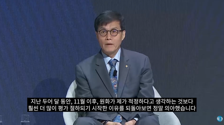 이 총재는 지난 28일 홍콩에서 열린 '글로벌 매크로 컨퍼런스'에서 얀 하치우스 골드만삭스 수석 이코노미스트와의 대담에서 "역사적으로 높은 경상수지 흑자를 기록하고 있음에도 원화가 적정 수준보다 과도하게 평가절하된 이유를 이해하기 어려웠다"고 말했다. 해당 대담 영상은 30일 한국은행 유튜브 채널을 통해 공개됐다.