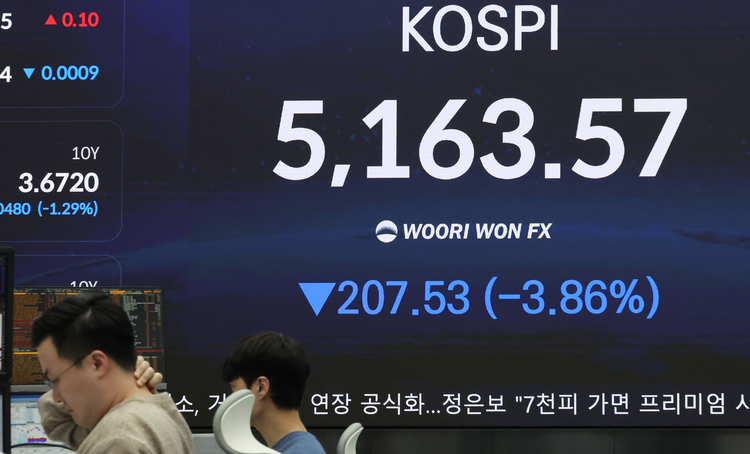 6일 한국거래소에 따르면 이날 코스피지수는 전장 대비 150.42p(2.91%) 하락한 5,013.15에 개장했다.