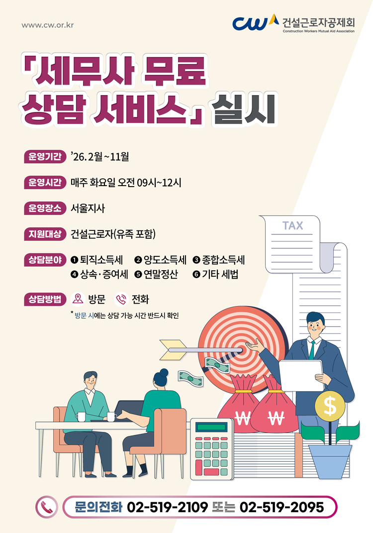 건설근로자공제회는 건설근로자 지원 대책의 일환으로 국세 및 지방세 등 각종 세금에 대한 전문적인 조언을 제공하는 '세무사 무료 상담 서비스'를 시작한다고 9일 밝혔다.