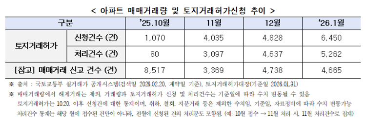 시는 주택시장 정보 공백을 최소화하기 위해 올해 1월 토지거래허가 신청 관련 정보도 함께 공개했다. 향후 매매거래 신고에 반영될 1월 토지거래허가 신규 신청은 6천450건으로 전월 대비 33.6% 늘었고, 이 가운데 5천262건이 처리됐다.