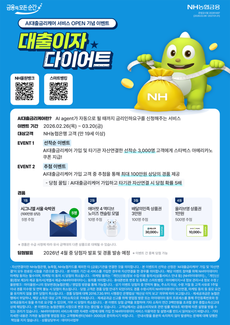 【 청년일보 】 NH농협은행이 대출 보유 고객의 금리 부담 완화를 지원하는 ‘AI대출금리케어’ 서비스 출시를 기념해 26일부터 3월 20일까지 ‘대출이자 다이어트’ 이벤트를 실시한다고 밝혔다.