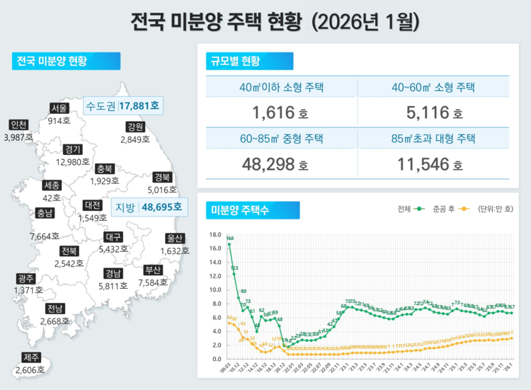 【 청년일보 】 지난달 전국의 준공 후 미분양이 3%대 증가율을 기록하며 다시 고개를 들었다. 악성 미분양 물량의 80% 이상이 지방에 집중된 가운데, 서울을 중심으로 한 매매 거래량은 회복세를 보이며 시장 양극화가 뚜렷해지는 양상이다.