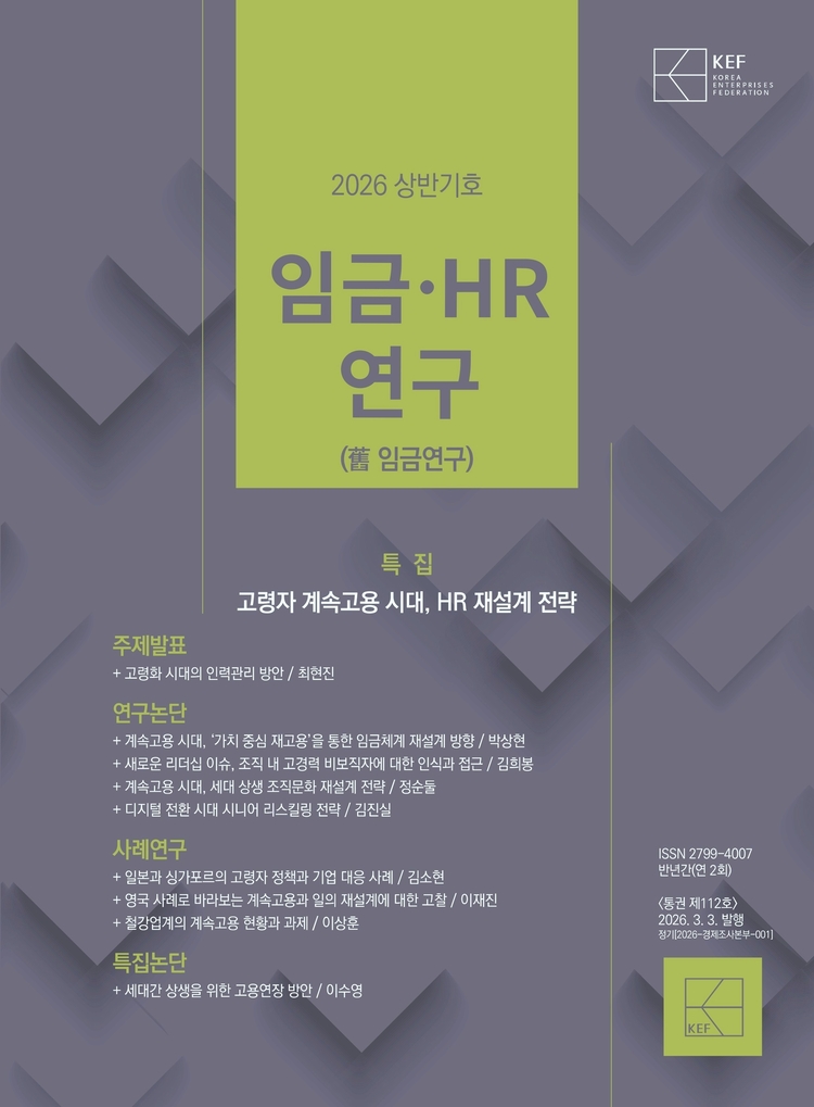 임금·HR연구는 국내외 기업의 인사·조직, 임금제도 관련 최근 이슈를 특집주제로 선정해 학계 및 현장전문가의 견해와 선도기업 사례를 전달함으로써 기업들의 합리적인 인사관리를 지원하고자 연 2회 발간하는 정기간행물이다.