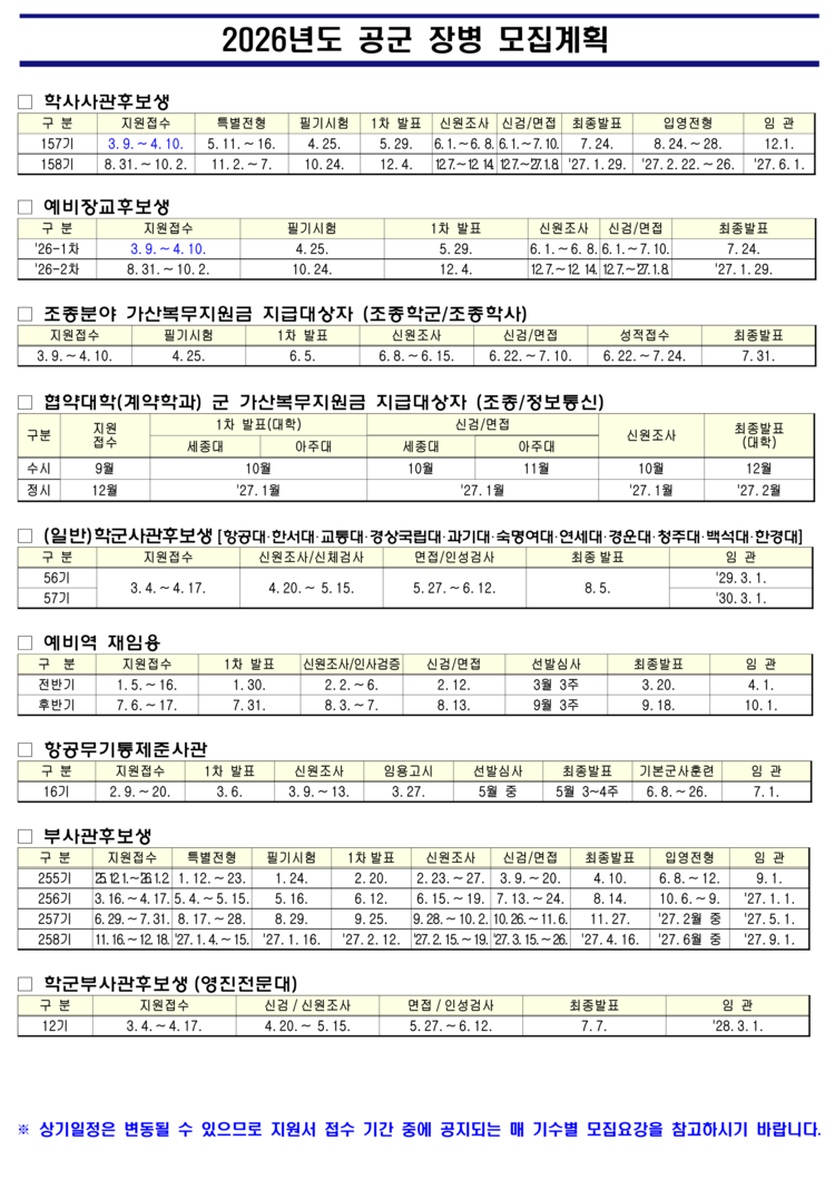 장교·부사관 지원자는 일반병처럼 무작위 전산선발이 아닌 서류, 체력, 면접, 신체검사 등 평가 전형이 유지된다. 지원은 병무청이 아닌 국방통합모집 포털에서 진행한다. 부사관 후보생에서도 항공특수통제사(CCT) 특별전형 등이 별도로 있어 확인이 필요하다. 학사사관·ROTC·예비장교 후보생, 부사관 후보생 등 전형에 따른 지원 요건과 전형 일정을 확인하고 체력검정·면접평가·증빙서류 등을 준비해야 한다.