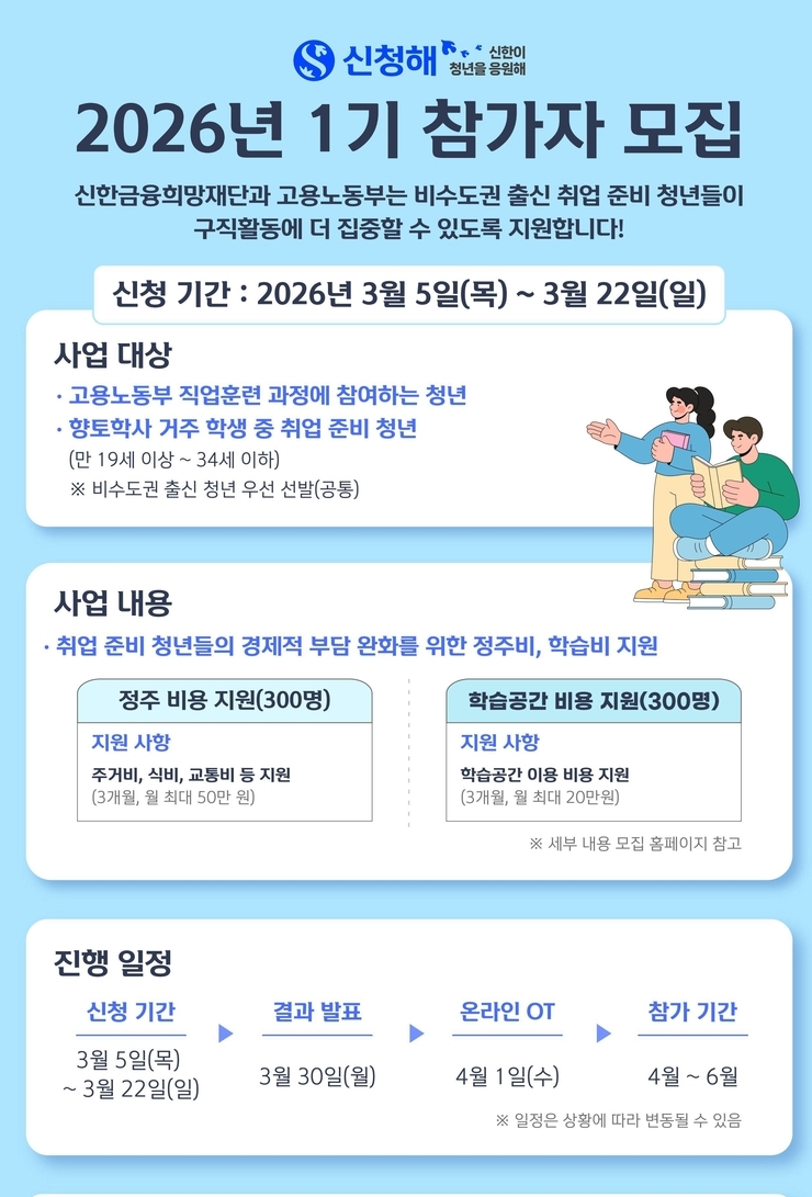 【 청년일보 】 신한금융희망재단(이사장 진옥동)은 경제적 여건이 어려운 취업준비 청년을 지원하는 ‘신한이 청년을 응원해’ 사업의 1차 지원자를 5일부터 22일까지 모집한다고 밝혔다.