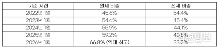 전세 부담을 견디지 못한 세입자들은 월세로 대거 유입되고 있다. 임대차 시장에서 월세 비중은 2022년 1월 45.6%에서 2026년 1월 기준 66.8%(16만9천305건)까지 치솟아 역대 최고치를 경신했다.