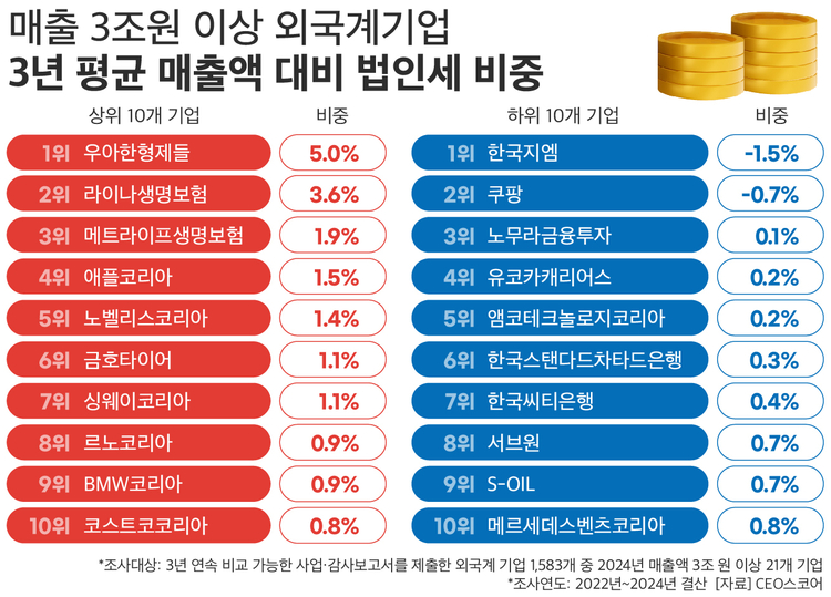 외국계 기업 가운데 3년 간 법인세 비중이 가장 높은 곳은 우아한형제들(5.0%)로 조사됐다. 우아한형제들은 매출액 대비 법인세 비중이 2022년 4.3%, 2023년 6.4%, 2024년 4.2%로, 3년 내내 업계 평균을 크게 웃돌았다.