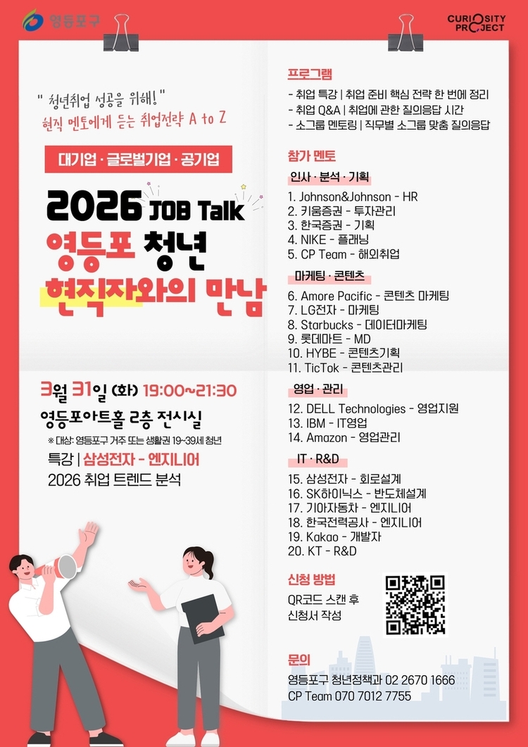 신청은 포스터의 QR코드를 통한 사전 신청이 원칙이며, 잔여 인원에 한해 당일 현장 접수도 가능하다. 자세한 사항은 영등포구청 누리집이나 '영등포 청년 네이버 카페'에서 확인할 수 있다.