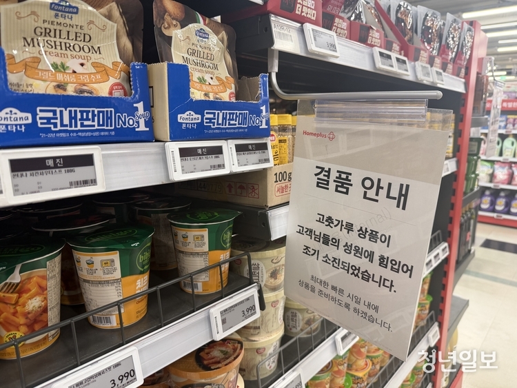 라면 코너에서 오랜 시간 체류하던 한 30대 소비자는 "신라면과 같이 기본적인 라면이 없는 건지, 찾지 못하는 건지 생각하며 한참을 헤맸다"며 "자세히 보니 매대에 가격표만 비치돼 있을 뿐 대부분 '매진'이라고 적혀 있는 것을 뒤늦게 발견했다"고 토로했다.