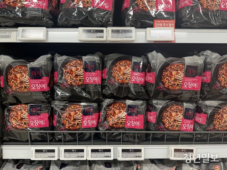 진열대 아래 위치한 가격표에는 여전히 이들 상품명이 적시돼 있었지만 '매진'이라고 표기되지 않은 상품을 찾기 어려울 정도였다. 대신 해당 라면 매대에는 하림 혹은 PB 상품들이 반복적으로 진열돼 있었다.