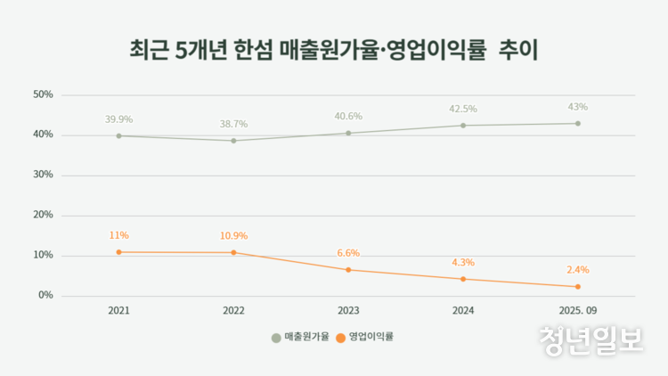 매출원가율은 2021년 39.9%에서 2022년 38.7%로 소폭 낮아졌지만 2023년 40.6%, 2024년 42.5%로 상승했다. 지난해 3분기 기준 43.0%까지 높아지며 원가 부담이 확대되는 흐름을 보였다.