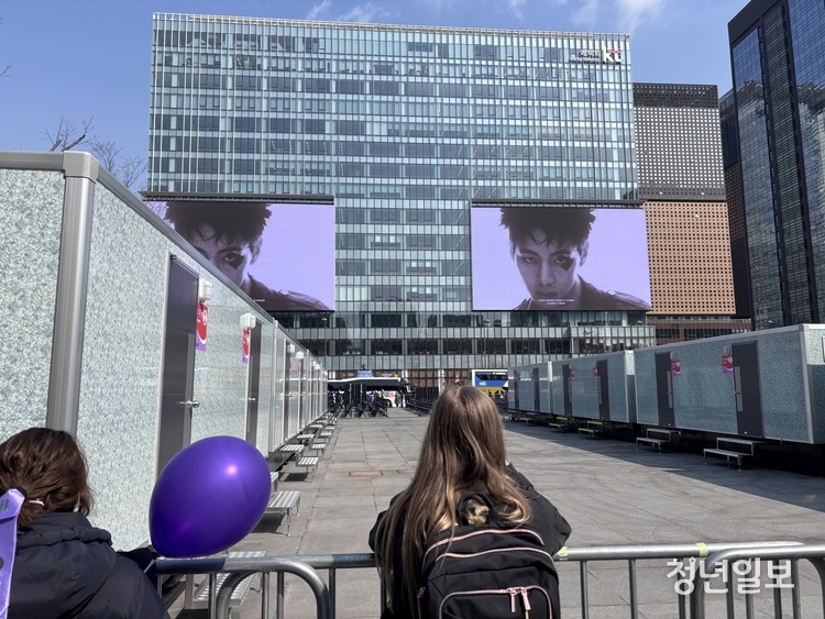 【 청년일보 】 방탄소년단(BTS) 컴백 공연을 하루 앞둔 20일 서울 종로구 광화문광장에서 외국인 팬들이 BTS 컴백 관련 영상을 촬영하고 있다.