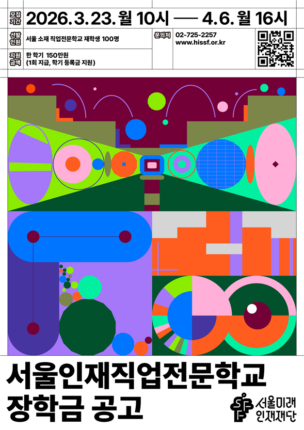 서울 소재 직업전문학교에서 학위 과정을 밟는 학생 100명에게 1인당 150만원을 지원하며, 4월 6일까지 학교 추천을 거쳐 재단 누리집에서 신청할 수 있다.
