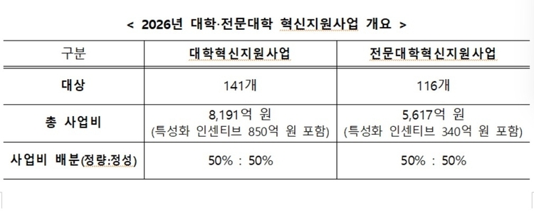 올해 혁신지원사업은 4년제 대학 141개에 총 8천191억원, 전문대 116개에 5천617억원이 투입될 예정이다.