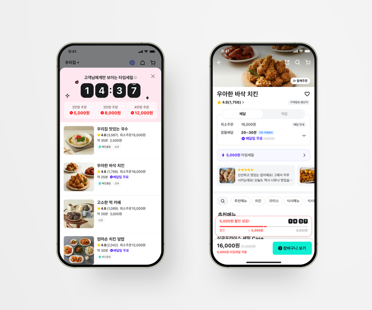 이들 브랜드의 타임세일은 조건에 부합하는 고객에게 자동으로 노출된다. 처음 이용하거나 최근 석 달 간 주문한 적이 없는 가게에서 사용할 수 있는 할인 혜택을 15분 한정으로 제공한다. 할인 조건은 ▲2만원 이상 주문 시 5천원 ▲3만원 이상 주문 시 8천원 ▲4만원 이상 주문 시 1만2천원 할인 등이다.