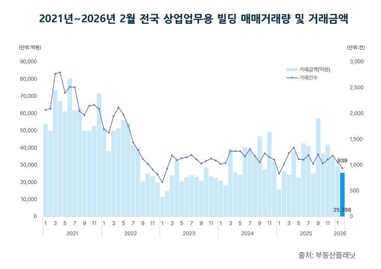 상업용 부동산 종합 플랫폼 기업 부동산플래닛은 2일 이 같은 내용을 담은 2026년 2월 전국 상업업무용 빌딩 매매거래 시장 분석 결과를 발표했다.