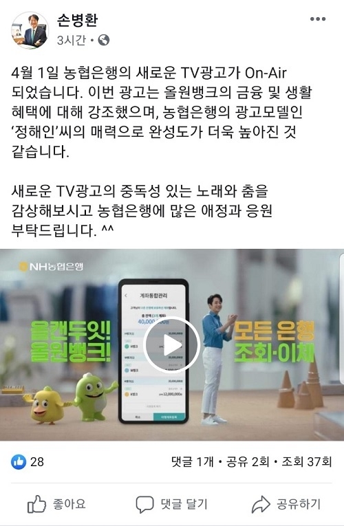 이어 지난 1일에는 농협은행의 새 TV광고 영상을 공유하기도 했다. 손 행장은 “이번 광고는 올원뱅크의 금융 및 생활 혜택에 대해 강조했으며, 농협은행의 광고모델인 ‘정해인’씨의 매력으로 완성도가 더욱 높아진 것 같다”며 “새로운 TV광고의 중독성 있는 노래와 춤을 감상해보시고 농협은행에 많은 애정과 응원 부탁드린다”고 말했다.