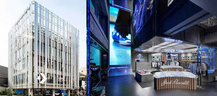 건물 외관은 불규칙한 길이의 알루미늄 파이프로 둘러싸여 리드미컬한 움직임을 만들어내며 역동적인 홍대 거리의 에너지를 반영했다. 건물 곳곳에 위치한 컨버스의 상징적인 스타 쉐브론 로고는 건물의 디자인과 어우러지면서 홍대 거리에 자연스럽게 녹아든다.