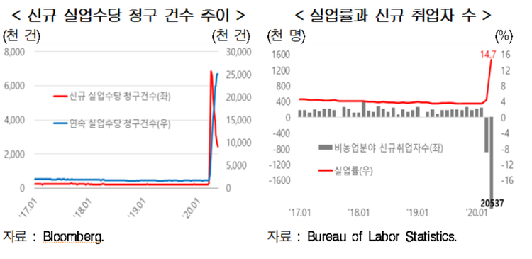 이에 현경연은 미국 역시 실업률도 급증했으며, 신규 취업자 수는 큰 폭으로 감소했다고 설명했다. 미국의 4월 실업률은 14.7%로 금융위기 당시 최고치인 10.0%(2009년 10월)보다 높은 수준으로, 통계집계 이래 역대 최고치를 기록했다. 이동 제한과 영업 제한으로 4월 비농업 신규 취업자 수도 전월 대비 2053만 명 감소한 것으로 나타났다.