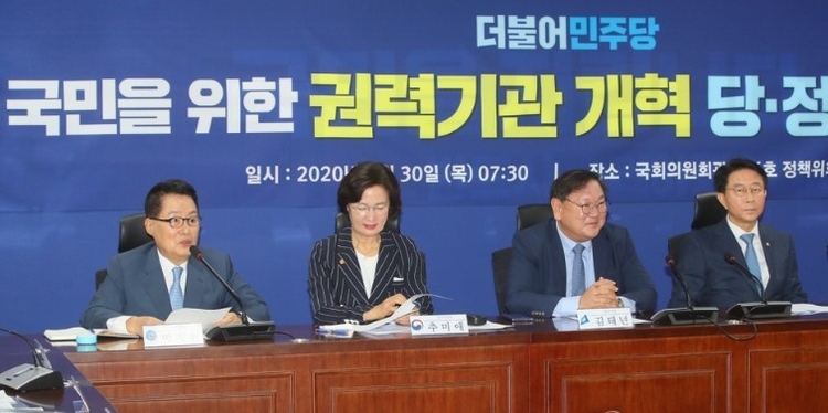 더불어민주당과 정부, 청와대는 30일 오전 국회에서 협의회를 열고 권력기관 개혁 완수를 위한 제도적 틀을 마련하기로 뜻을 모았다.