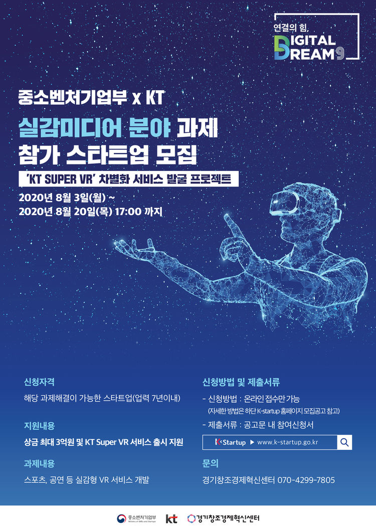 이번 공모전은 대기업이 제시한 과제를 스타트업이 해결하는 새로운 협업 방식의 프로젝트인 '연결의 힘, 디지털 드림 9'의 일환으로 진행된다. KT는 중기부가 지원하는 인공지능(AI), 콘텐츠, 친환경 소재 등 포스트 코로나 시대를 대표하는 총 9개 분야 중 실감미디어 분야의 프로젝트 주관 기업으로 선정됐다.