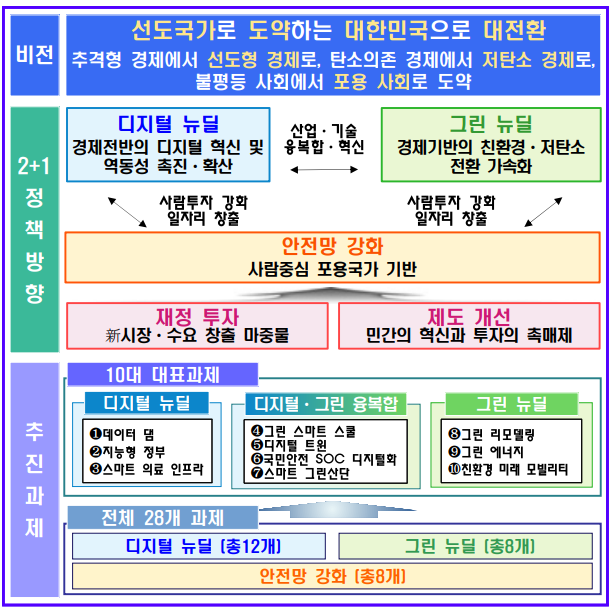 2020년 추가경정예산(추경)부터 2022년까지 총 23.4조 원(국비 18.6조 원), 2025년까지 58.2조 원(국비 44.8조 원)을 투자해 2022년까지 39만, 2025년까지 90.3만 개의 일자리를 창출하고 디지털 대전환을 선도하는 것이 디지털 뉴딜의 주요 골자다.